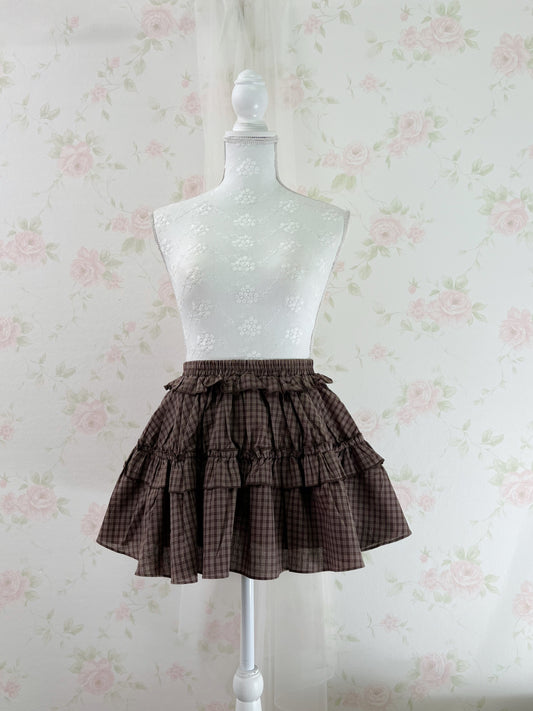 GRL Ruffled Hem Shoujo Checked Tiered Skirt (Chocolate)