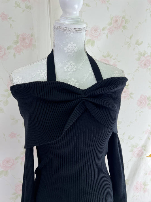 GRL Ribbon Front Halter Neck Knit Top (Black)
