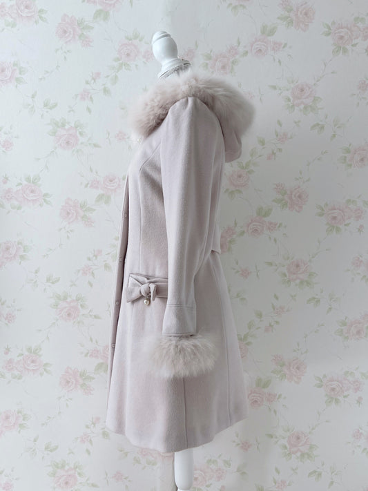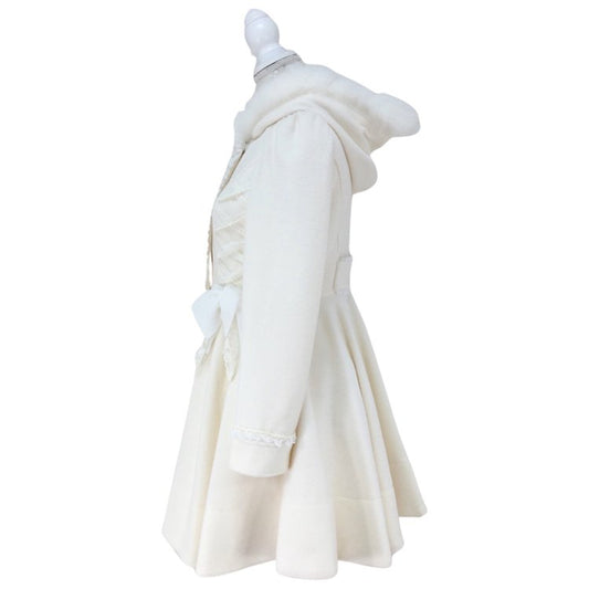 mille fille closet Side Laced Up Fur Hoodie Wool Coat (White)