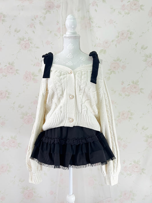 MultiPal Store Original Pom Pom Lace Strap Shaggy Sweater (Ivory)