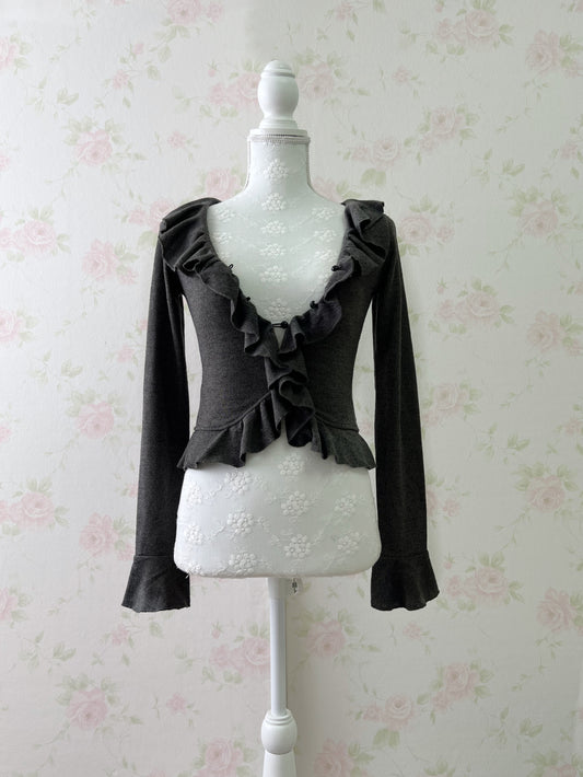 GRL Ruffled V Neck Cardigan (Dark Gray)
