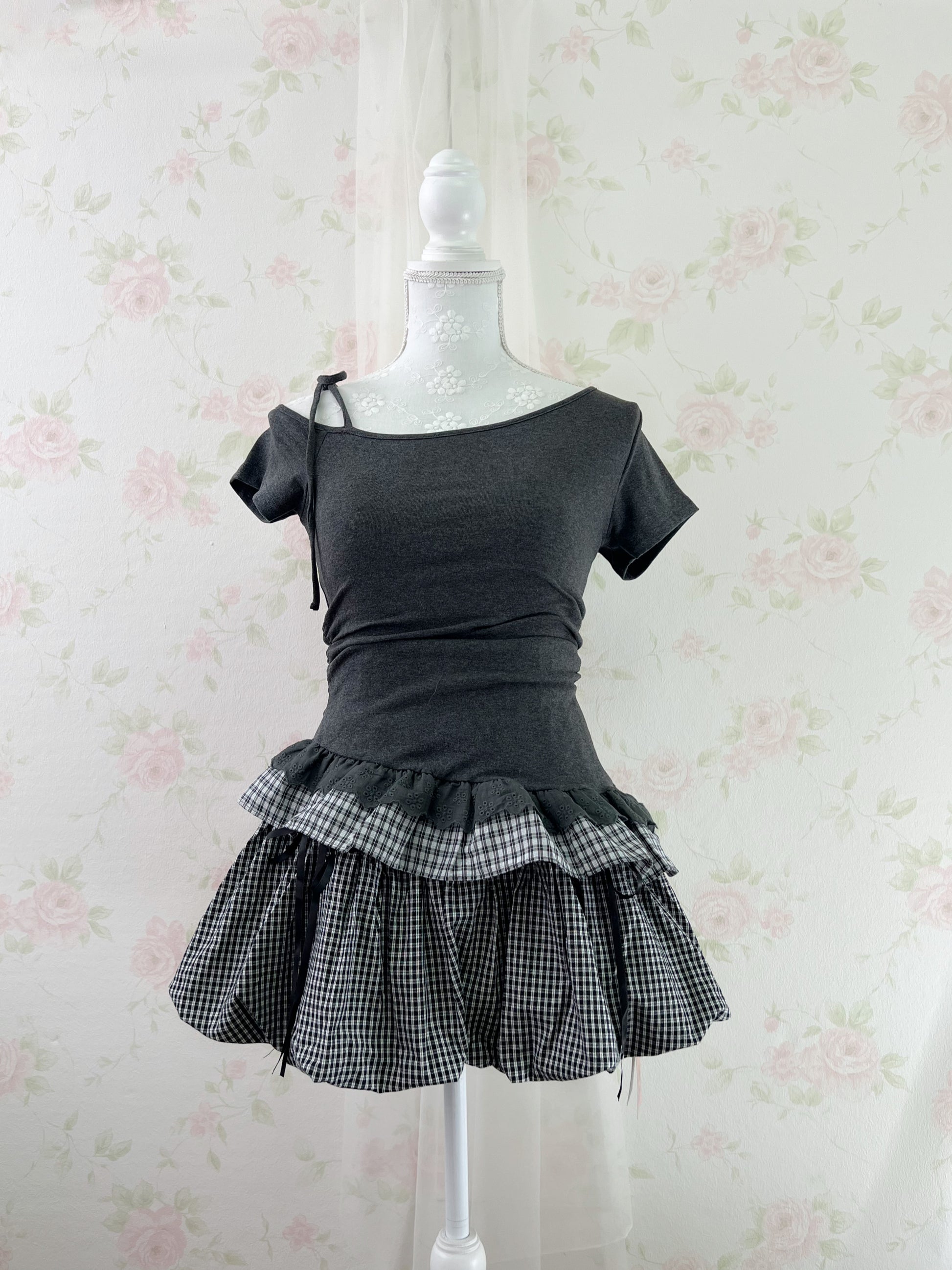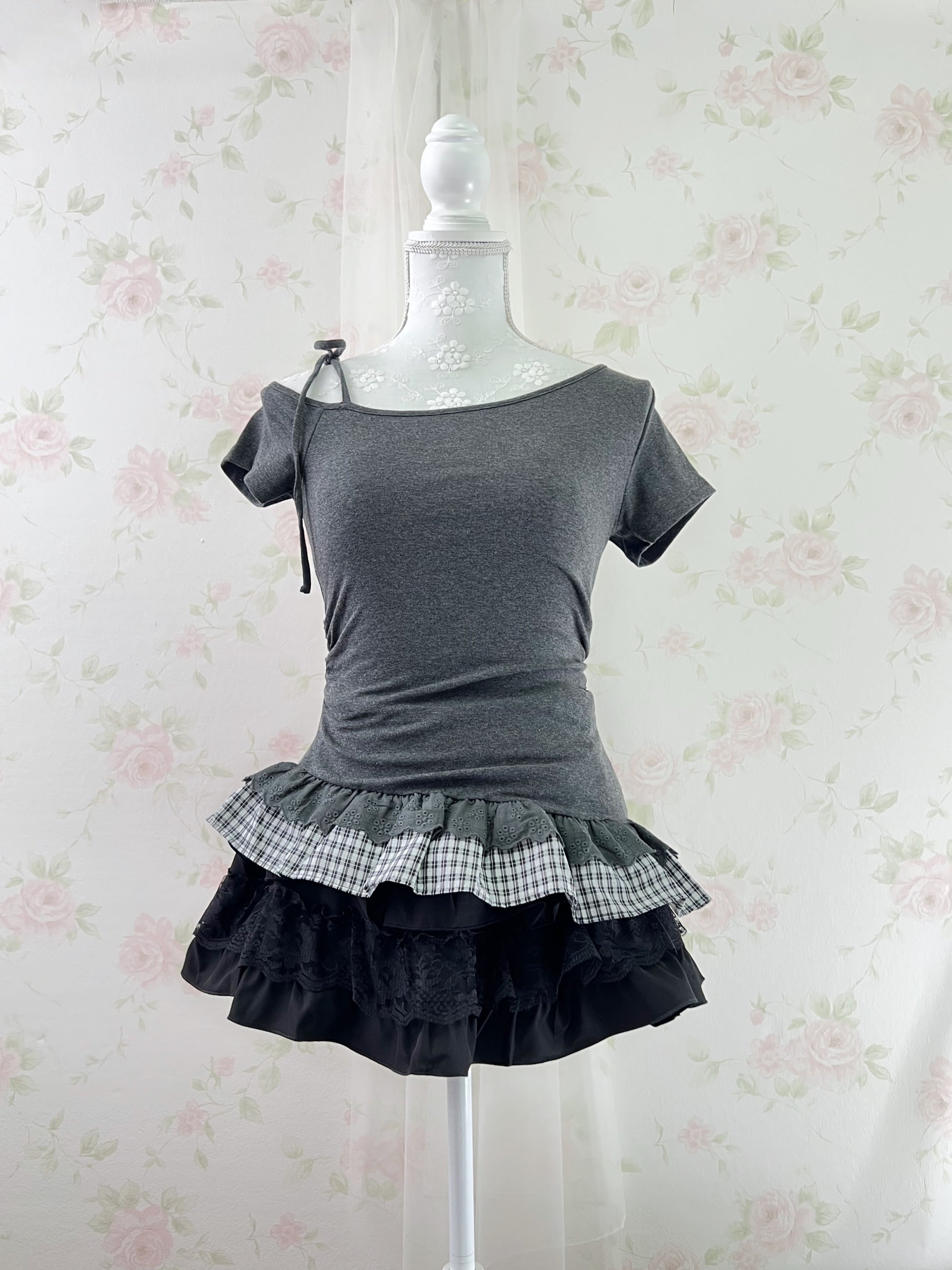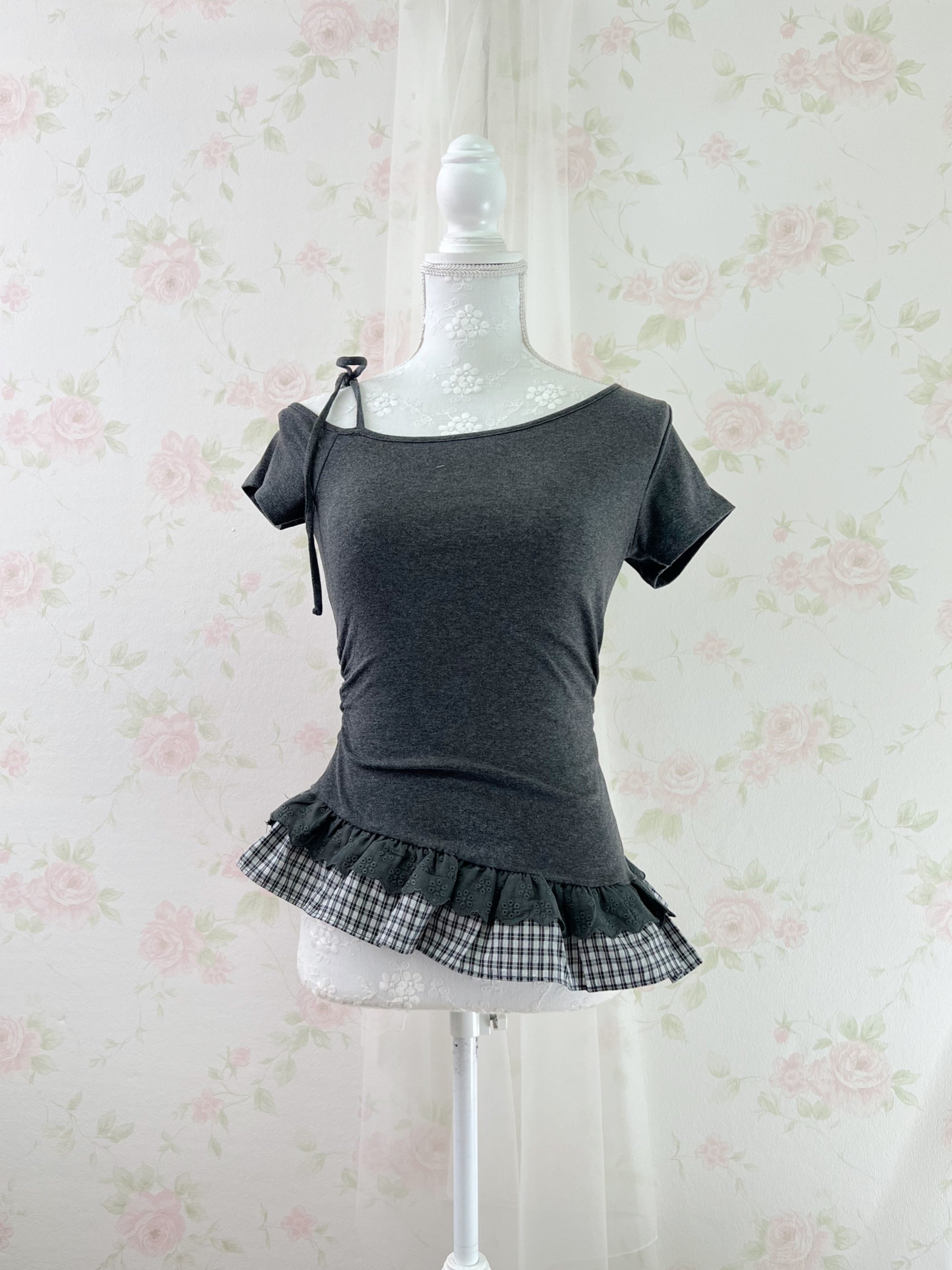 GRL Checked Ruffled Hem One Shoulder T-shirt