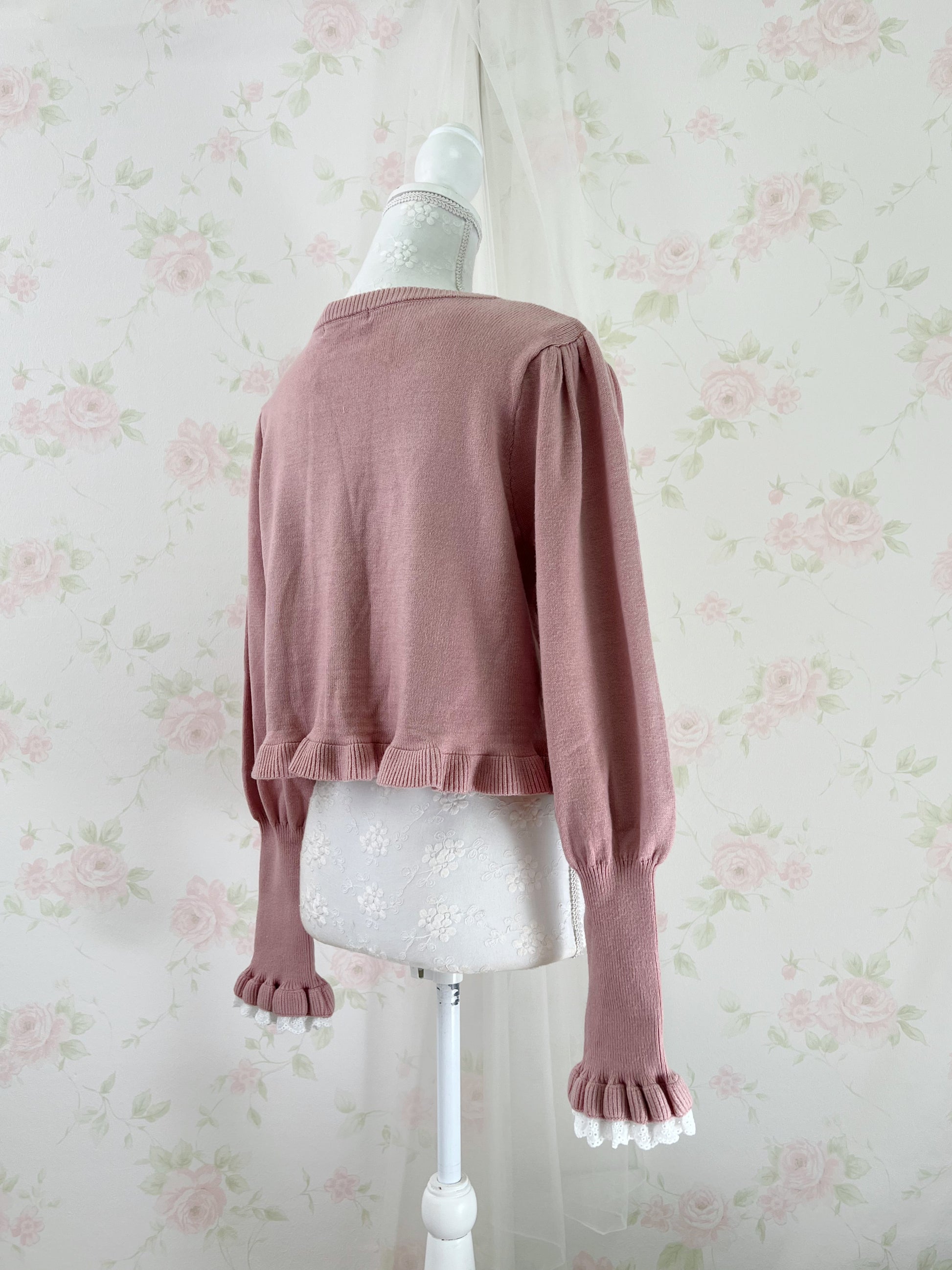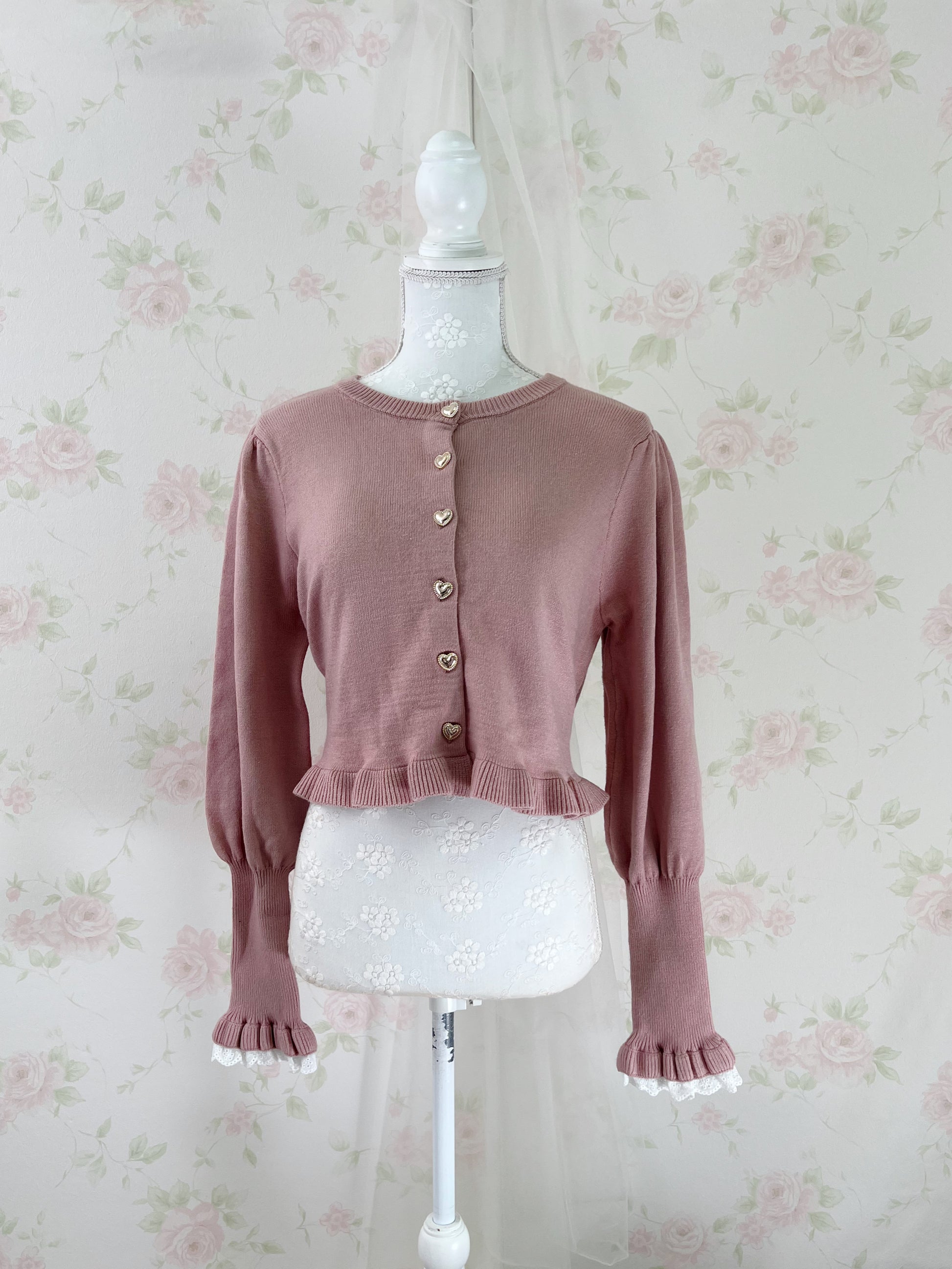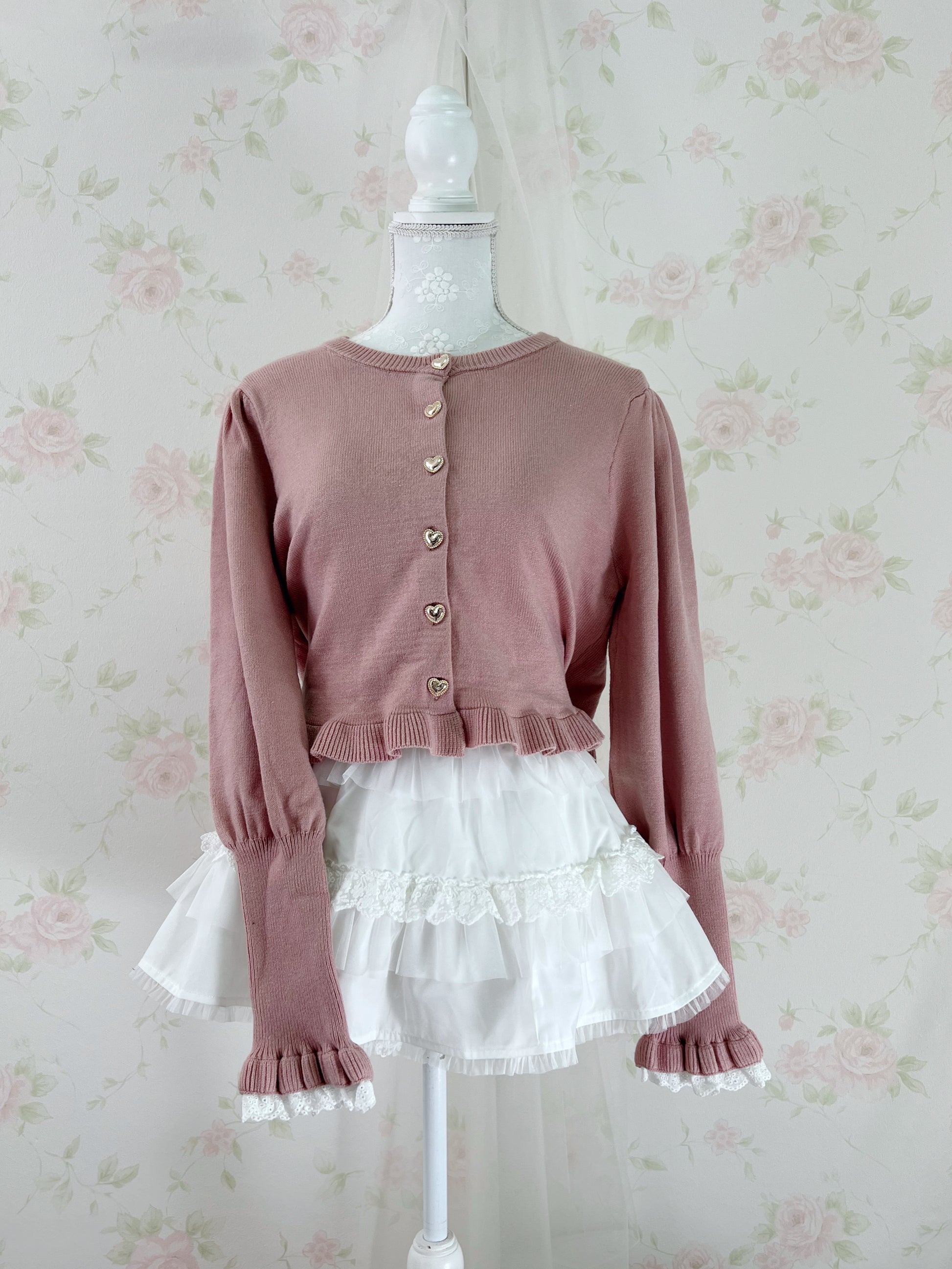 Gold Heart Button Cotton Lace Sleeve Cardigan (Pink)