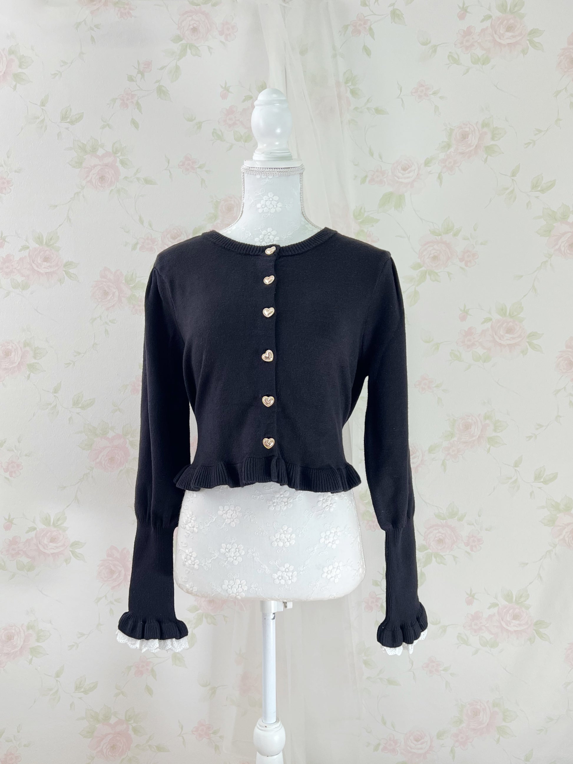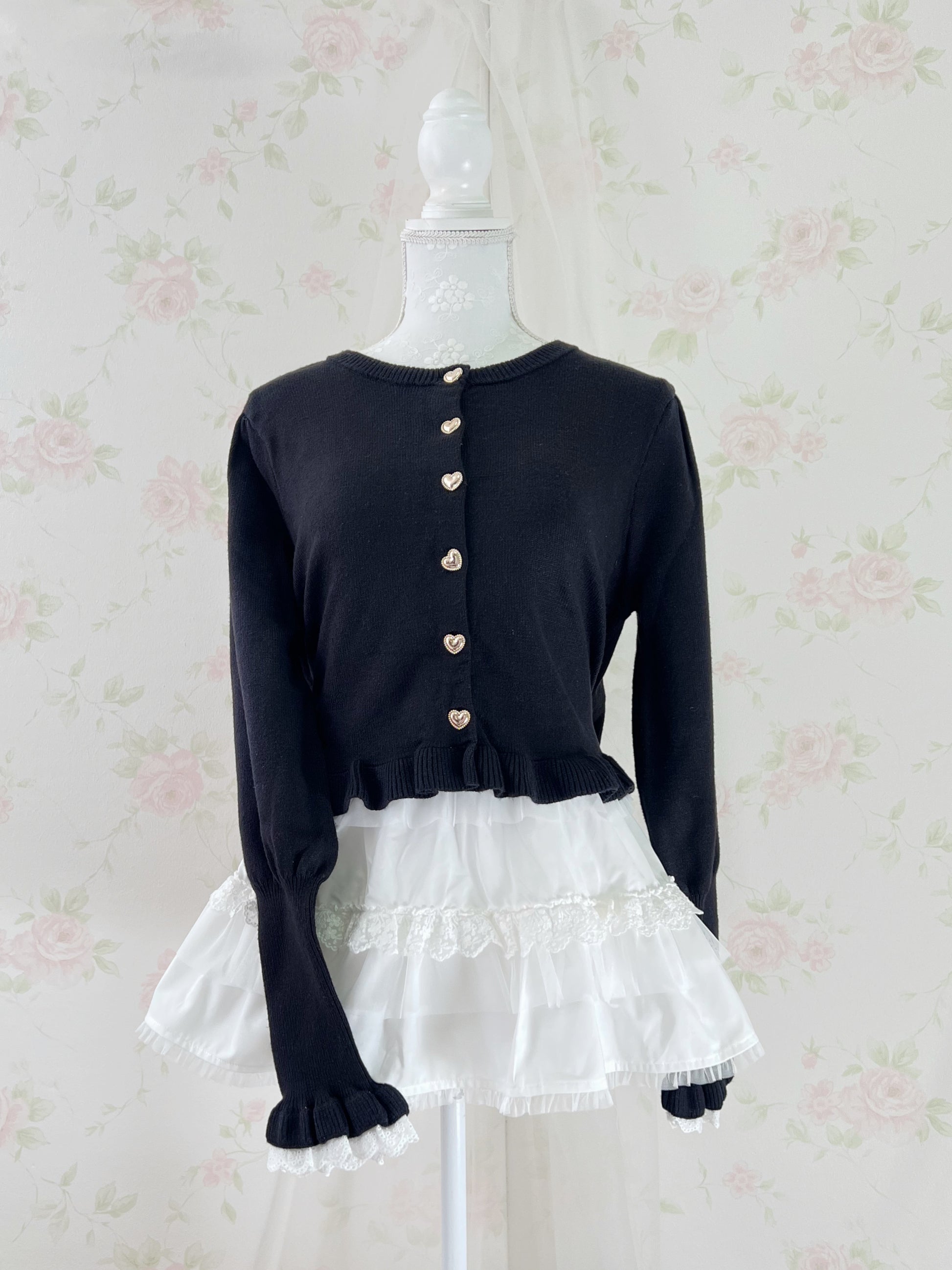 Gold Heart Button Cotton Lace Sleeve Cardigan (Black)